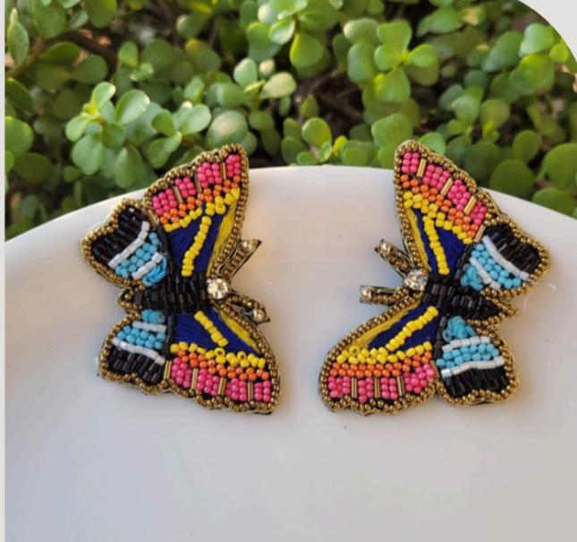 the product is a pair of handcrafted, multicolored beaded butterfly statement earrings.