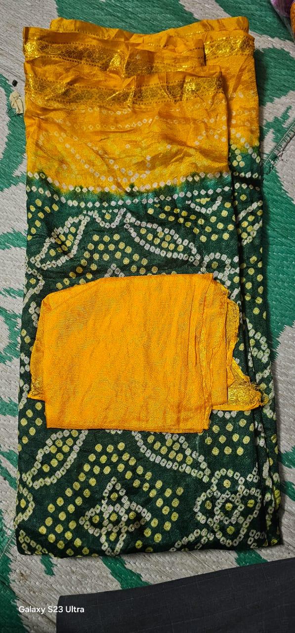 This elegant Chinnan Bandhej Saree features classic Rajasthani tie-dye patterns with vibrant colors and a contrasting pallu. Crafted from soft fabric for all-day comfort, perfect for festive occasions, functions, and daily wear.